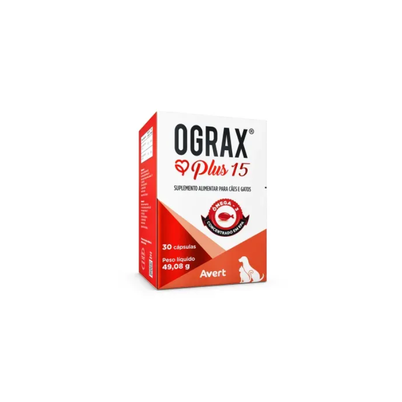 SUPLEMENTO ALIMENTAR OGRAX PLUS 15 PARA CÃES E GATOS 30 CÁPSULAS